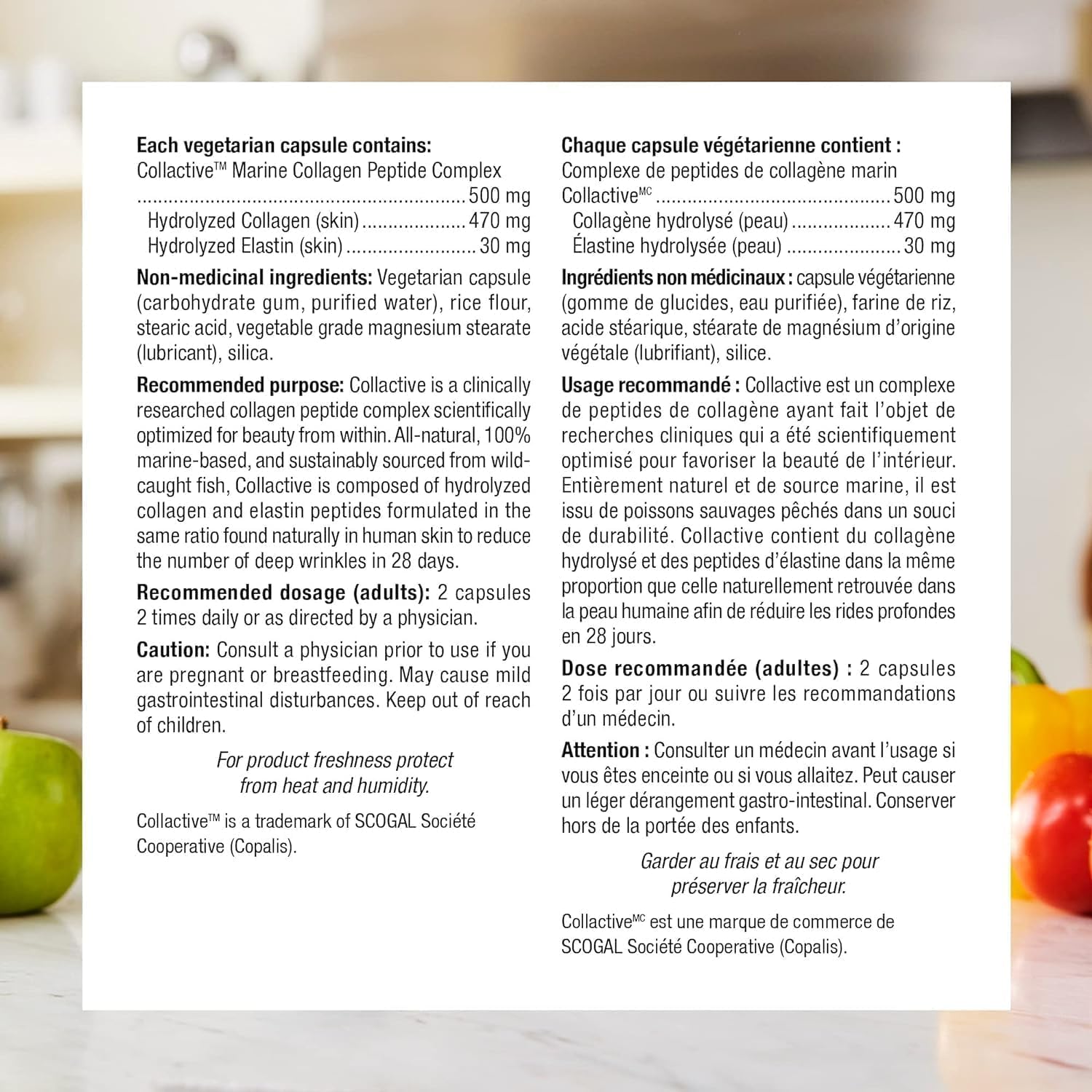 - Ingredients: Collactive™ Marine Collagen Peptide Complex 500mg per capsule (Hydrolyzed Collagen 470mg, Hydrolyzed Elastin 30mg). Source: Wild-caught fish. Other Ingredients: Vegetarian capsule (carbohydrate gum, purified water), rice flour, stearic acid, vegetable grade magnesium stearate (lubricant), silica.